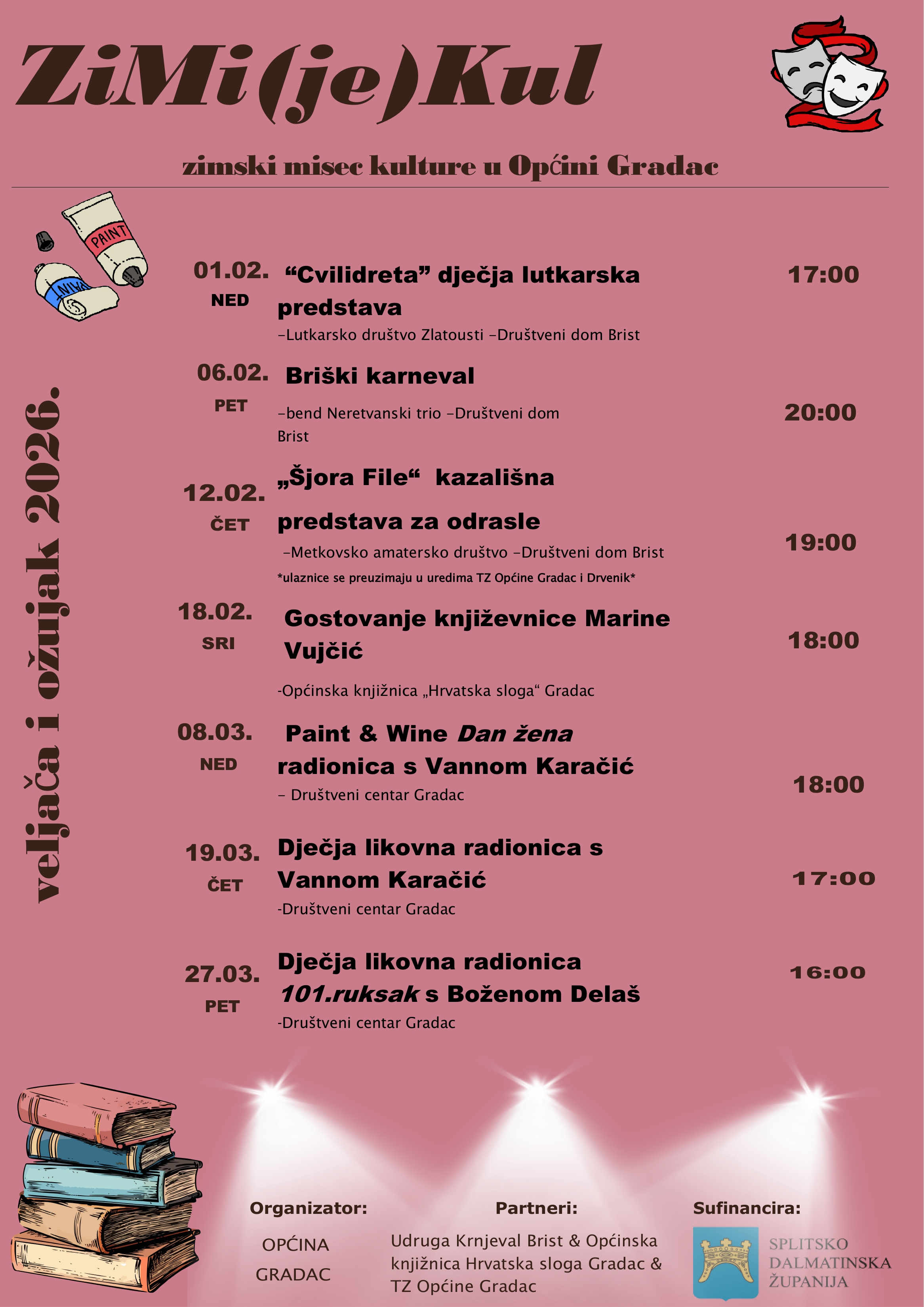 Kako bismo malo „oživjeli“ ovo zimsko razdoblje, pripremili smo drugo izdanje kulturnog programa pod nazivom ZiMi(je)Kul – zimski misec kulture u općini Gradac kojim ćemo, veljaču i ožujak, obogatiti raznim događanjima za djecu i odrasle.